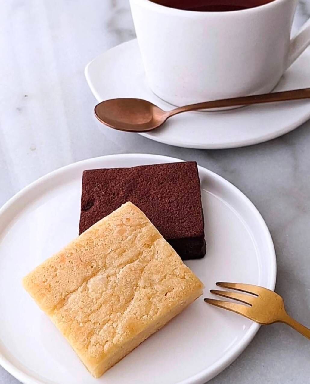 【原材料】ファッジブラウニー:甜菜糖(北海道)、バター、チョコレート(カカオマス、砂糖、ココアバター)、卵、カカオマス、小麦粉、クルミ、ココアパウダー、コーヒー/香料、レシチン(一部に卵、乳成分、小麦、大豆、クルミ、を含む)